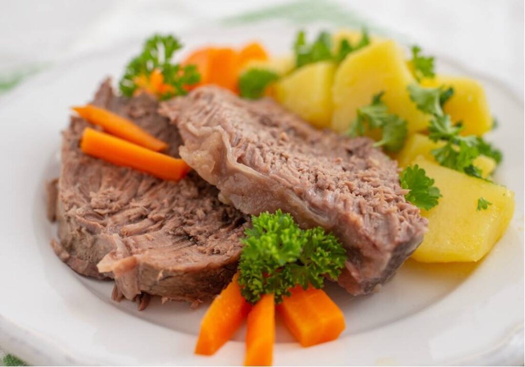 Carne de ternera cocida al estilo vienés pero con toque local, servida jugosa con salsas y guarniciones originales de Frankfurt.